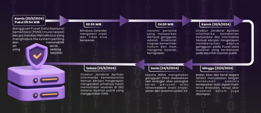 Pada 20 Juni 2024, server PDNS mengalami gangguan serius akibat serangan ransomware, menyebabkan gangguan pada layanan publik, termasuk layanan keimigrasian. Insiden ini pertama kali dilaporkan oleh penyedia layanan PDNS 2, yang segera memicu koordinasi antara Kominfo, BSSN, dan penyedia layanan terkait.
